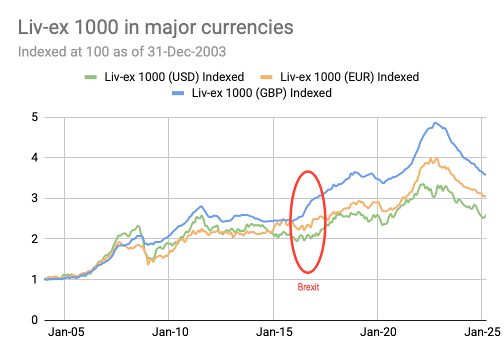 Over the same 20-year period, that very same index returned roughly 3x in EUR and 2.6x in USD. In other words, a meaningful part of the 3.6x headline return in GBP wasn’t “wine performance” at all — it was GBP weakening.