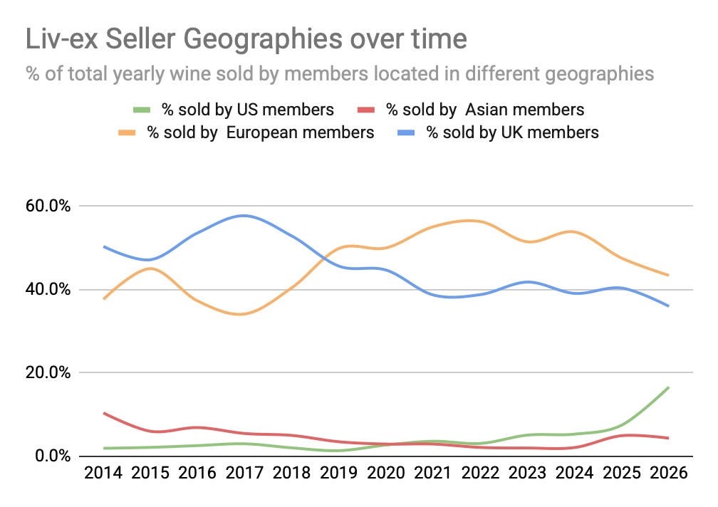 Once it reaches the secondary market, fine wine remains, for the most part, a EUR asset — but it tends to also be quoted and traded in GBP. That said, as you can see from the Liv-ex chart below, trading is still largely driven by European players (around 45%) and UK players (around 40%).