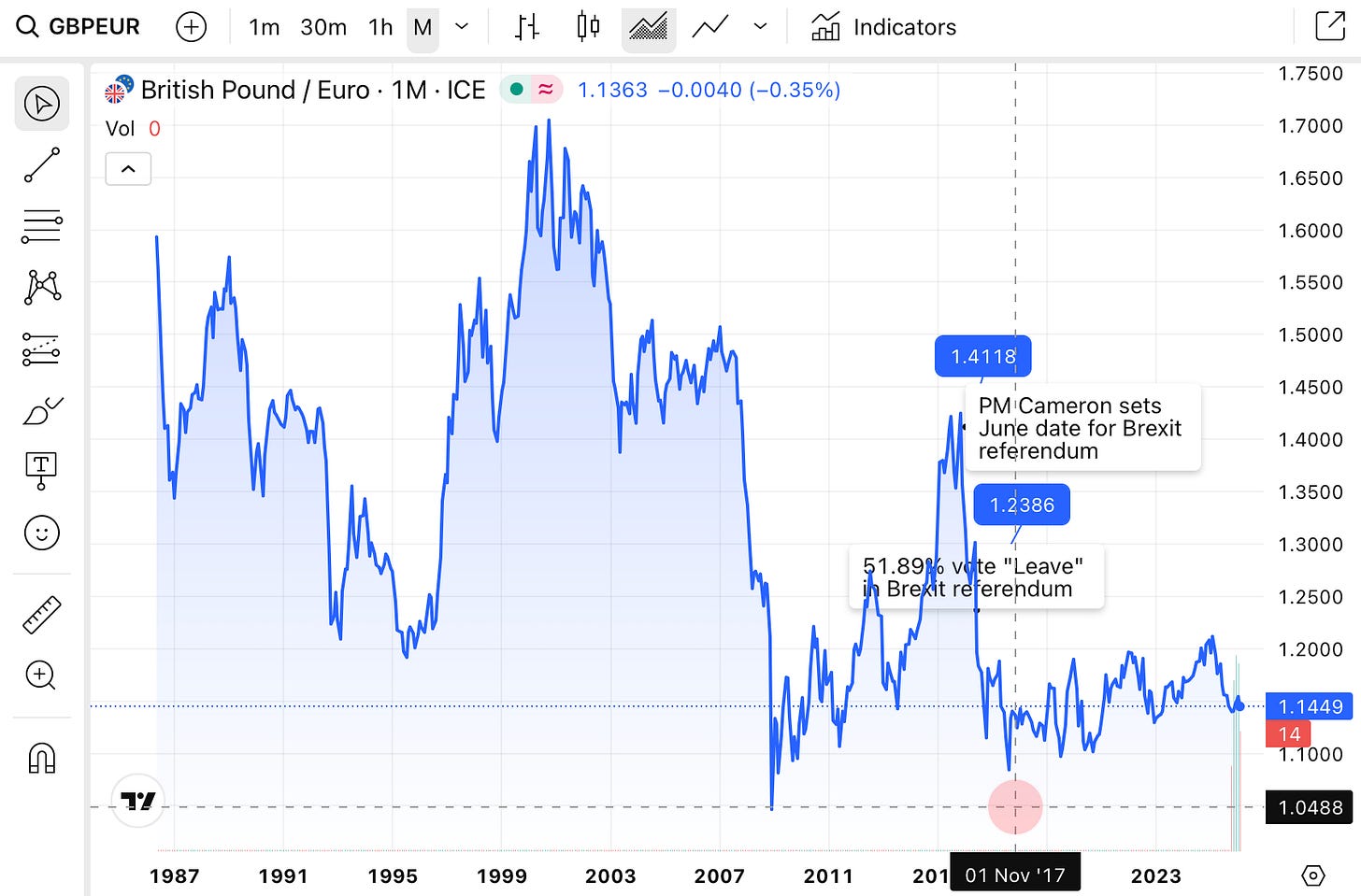 That means that, in 2016, if you were a GBP earner holding European wine, you were effectively short sterling and long euros. Your asset would have appeared to appreciate by 22% in GBP terms — roughly 5% from the underlying move in wine prices, and about 17% from the depreciation of the currency you were “short”.