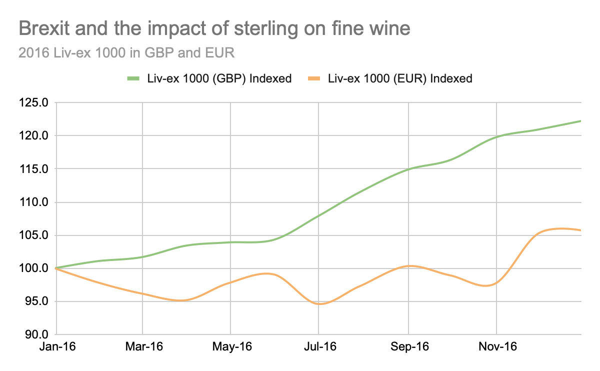 In 2016, the Liv-ex 1000 index was up 22% in GBP, while the same index was up only 5% in EUR. The gap (around 17 percentage points) was largely driven by the sharp move in sterling.