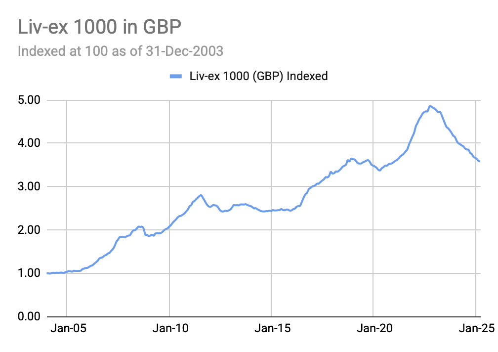 And because Liv-ex is based in London, its indices are quoted in GBP. Over the past 20 years, the main Liv-ex index has risen by roughly 3.6x.